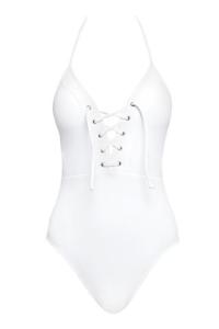 - Deep-V lace up halter cut out one piece swimsuit in white.